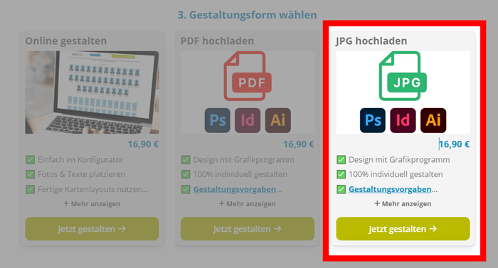 - Im 3. Schritt „Gestaltungsform wählen“ dann „JPG hochladen“ wählen