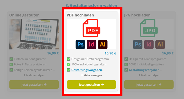 - Im 3. Schritt „Gestaltungsform wählen“ dann „PDF hochladen“ wählen