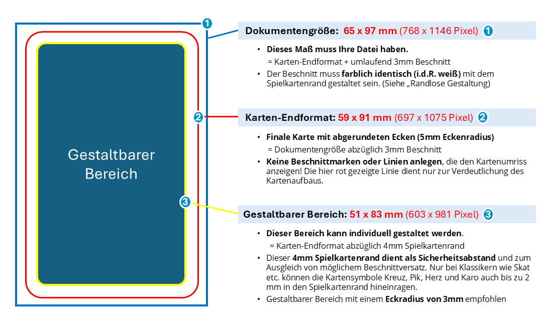 - Platzieren Sie wichtige Motive nur im „Gestaltbaren Bereich“ – nur bei Klassikern (z. B. Skat) dürfen die Symbole bis zu 2 mm in den Spielkarten-Rand hineinragen.